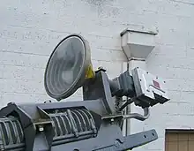 A horn antenna or microwave horn is an antenna that consists of a flaring metal waveguide shaped like a horn to direct radio waves in a beam. Horns are widely used as antennas at UHF and microwave frequencies, above 300 MHz.[1] They are used as feed antennas (called feed horns) for larger antenna structures such as parabolic antennas, as standard calibration antennas to measure the gain of other antennas, and as directive antennas for such devices as radar guns, automatic door openers, and microwave radiometers.[2] Their advantages are moderate directivity, broad bandwidth, low losses, and simple construction and adjustment.[3]