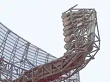 A type of antenna that combines a horn with a parabolic reflector is known as a Hogg-horn, or horn-reflector antenna, invented by Alfred C. Beck and Harald T. Friis in 1941[20] and further developed by David C. Hogg at Bell labs in 1961.[21] It is also referred to as the "sugar scoop" due to its characteristic shape. It consists of a horn antenna with a reflector mounted in the mouth of the horn at a 45 degree angle so the radiated beam is at right angles to the horn axis. The reflector is a segment of a parabolic reflector, and the focus of the reflector is at the apex of the horn, so the device is equivalent to a parabolic antenna fed off-axis.[22] The advantage of this design over a standard parabolic antenna is that the horn shields the antenna from radiation coming from angles outside the main beam axis, so its radiation pattern has very small sidelobes.[23] Also, the aperture isn't partially obstructed by the feed and its supports, as with ordinary front-fed parabolic dishes, allowing it to achieve aperture efficiencies of 70% as opposed to 55–60% for front-fed dishes.[22] The disadvantage is that it is far larger and heavier for a given aperture area than a parabolic dish, and must be mounted on a cumbersome turntable to be fully steerable. This design was used for a few radio telescopes and communication satellite ground antennas during the 1960s. Its largest use, however, was as fixed antennas for microwave relay links in the AT&T Long Lines microwave network.[21][23][24] Since the 1970s this design has been superseded by shrouded parabolic dish antennas, which can achieve equally good sidelobe performance with a lighter more compact construction. Probably the most photographed and well-known example is the 15-meter-long (50-foot) Holmdel Horn Antenna[21] at Bell Labs in Holmdel, New Jersey, with which Arno Penzias and Robert Wilson discovered cosmic microwave background radiation in 1965, for which they won the 1978 Nobel Prize in Physics. Another more recent horn-reflector design is the cass-horn, which is a combination of a horn with a cassegrain parabolic antenna using two reflectors.[25]