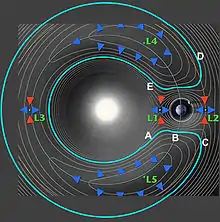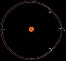 An example of a tadpole orbit is Polydeuces, a small moon of Saturn which librates around the trailing L5 point relative to a larger moon, Dione. In relation to the orbit of Earth, the 300-metre-diameter (980-foot) asteroid 2010 TK7 is in a tadpole orbit around the leading L4 point. 2020 VT1 follows a temporary horseshoe orbit with respect to Mars.[4]