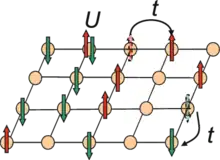 The Hubbard model states that each electron experiences competing forces: one pushes it to tunnel to neighboring atoms, while the other pushes it away from its neighbors.[2] Its Hamiltonian thus has two terms: a kinetic term allowing for tunneling ("hopping") of particles between lattice sites and a potential term reflecting on-site interaction. The particles can either be fermions, as in Hubbard's original work, or bosons, in which case the model is referred to as the "Bose–Hubbard model".