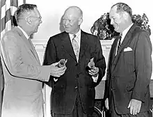 After John Glenn's orbital flight, an exchange of letters between President John F. Kennedy and Soviet Premiere Nikita Khrushchev led to a series of discussions led by Dryden and Soviet scientist Anatoli Blagonravov. Their talks in 1962 led to the Dryden-Blagonravov agreement, which was formalized in October of that year, the same time the two countries were in the midst of the Cuban Missile Crisis. The agreement was formally announced at the United Nations on December 5, 1962. It called for cooperation on the exchange of data from weather satellites, a study of the Earth's magnetic field, and joint tracking of the U.S. Echo II balloon satellite.[4] Unfortunately, as the competition between the two nation's manned space programs heated up, efforts to further cooperation at that point came to an end. They would be revived in 1969 by NASA Administrator Thomas O. Paine and led to the 1975 Apollo-Soyuz Test Project.[5]