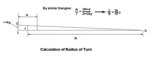 The train stays on the track by virtue of the conical shape of the wheel treads. If a wheelset is displaced to one side by an amount y (the tracking error), the radius of the tread in contact with the rail on one side is reduced, while on the other side it is increased. The angular velocity is the same for both wheels (they are coupled via a rigid axle), so the larger diameter tread speeds up, while the smaller slows down. The wheel set steers around a centre of curvature defined by the intersection of the generator of a cone passing through the points of contact with the wheels on the rails and the axis of the wheel set. Applying similar triangles, we have for the turn radius: