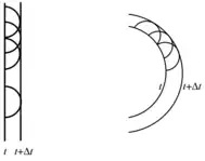 While the Huygens' principle of double refraction explains the phenomenon of double refraction in an optically anisotropic medium, the Huygens–Fresnel principle pertains to the propagation of waves in an optically isotropic medium.[3][4] According to the Huygens–Fresnel principle, each point on a wavefront can be considered a secondary point source of waves, so a new wavefront is formed after the secondary wavelets have traveled for a period equal to one vibration cycle. This new wavefront can be described as an envelope or tangent surface to these secondary wavelets.[5] Understanding and forecasting the classical wave propagation of light is based on the Huygens-Fresnel principle.[3]