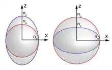 The ordinary ray (o-ray) has a spherical wavefront because the o-ray has a constant refractive index (n0) independent of propagation direction inside the uniaxial material and the same velocity in all directions. On the other hand, the extraordinary ray (E-ray) has an ellipsoidal wavefront due to its refractive index, which varies with the propagation direction within the uniaxial material, leading to different velocities in different directions. The two wavefronts come into contact at the points where they intersect with the optical axis.[1]