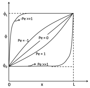 For a low Peclet number (|Pe|<2) the flow is characterized as dominated by diffusion. For large Peclet number the flow is dominated by convection.