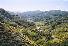 In the Archaic epoch of the Philippines, hydraulic engineering also developed specially in the Island of Luzon, the Ifugaos of the mountainous region of the Cordilleras built irrigations, dams and hydraulic works and the famous Banaue Rice Terraces as a way for assisting in growing crops around 1000 BC.[6] These Rice Terraces are 2,000-year-old terraces that were carved into the mountains of Ifugao in the Philippines by ancestors of the indigenous people. The Rice Terraces are commonly referred to as the "Eighth Wonder of the World".[7][8][9] It is commonly thought that the terraces were built with minimal equipment, largely by hand. The terraces are located approximately 1500 metres (5000 ft) above sea level. They are fed by an ancient irrigation system from the rainforests above the terraces. It is said that if the steps were put end to end, it would encircle half the globe.[10]