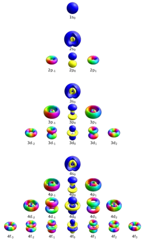 From these we see that in the S1/2 orbital (k = −1), the top two components of Ψ have zero orbital angular momentum like Schrödinger S orbitals, but the bottom two components are orbitals like the Schrödinger P orbitals. In the P1/2 solution (k = 1), the situation is reversed. In both cases, the spin of each component compensates for its orbital angular momentum around the z axis to give the right value for the total angular momentum around the z axis.