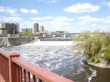 The growing demand for the Industrial Revolution would drive development as well.[42] At the beginning of the Industrial Revolution in Britain, water was the main power source for new inventions such as Richard Arkwright's water frame.[43] Although water power gave way to steam power in many of the larger mills and factories, it was still used during the 18th and 19th centuries for many smaller operations, such as driving the bellows in small blast furnaces (e.g. the Dyfi Furnace) and gristmills, such as those built at Saint Anthony Falls, which uses the 50-foot (15 m) drop in the Mississippi River.[44][43]