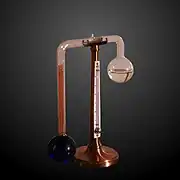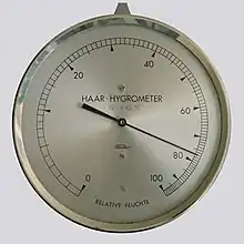 A hygrometer is an instrument which measures the humidity of air or some other gas: that is, how much water vapor it contains.[1] Humidity measurement instruments usually rely on measurements of some other quantities such as temperature, pressure, mass and mechanical or electrical changes in a substance as moisture is absorbed. By calibration and calculation, these measured quantities can lead to a measurement of humidity. Modern electronic devices use the temperature of condensation (called the dew point), or they sense changes in electrical capacitance or resistance to measure humidity differences. A crude hygrometer was invented by Leonardo da Vinci in 1480. Major leaps came forward during the 1600s; Francesco Folli invented a more practical version of the device, while Robert Hooke improved a number of meteorological devices including the hygrometer. A more modern version was created by Swiss polymath Johann Heinrich Lambert in 1755. Later, in the year 1783, Swiss physicist and Geologist Horace Bénédict de Saussure invented the first hygrometer using human hair to measure humidity.