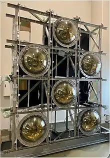 The Intermediate Water Cherenkov Detector (IWCD) will be located at a distance of around 750 metres (2,460 ft) from the neutrino production place. It will be a cylinder filled with water of 10 metres (33 ft) diameter and 50 metres (160 ft) height with a 10 metres (33 ft) tall structure instrumented with around 400 multi-PMT modules (mPMTs), each consisting of nineteen 8 centimetres (3.1 in) diameter PhotoMultiplier Tubes (PMTs) encapsulated in a water-proof vessel. The structure will be moved in a vertical direction by a crane system, providing measurements of neutrino interactions at different off-axis angles (angles to the neutrino beam centre), spanning from 1° at the bottom to 4° at the top, and thus for different neutrino energy spectra.[note 1] Combining the results from different off-axis angles, it is possible to extract the results for nearly monoenergetic neutrino spectrum without relying on theoretical models of neutrino interactions to reconstruct neutrino energy. Usage of the same type of detector as the far detector with almost the same angular and momentum acceptance allows comparison of results from these two detectors without relying on detector response simulations. These two facts, independence from the neutrino interaction and detector response models, will enable HK to minimise systematic error in the oscillation analysis. Additional advantages of such a design of the detector is the possibility to search for sterile oscillation patterns for different off-axis angles and to obtain a cleaner sample of electron neutrino interactions, whose fraction is larger for larger off-axis angles.[3]: 47–50 [14][15][16][17]