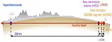 The Hyper-Kamiokande detector will be built 650 metres (2,130 ft) under the peak of Nijuugo Mountain in the Tochibora mine, 8 kilometres (5.0 mi) south from the Super-Kamiokande (SK) detector. Both detectors will be at the same off-axis angle (2.5°) to the neutrino beam centre and at the same distance (295 kilometres (183 mi)) from the beam production place in J-PARC.[note 2][3]: 35 [18]