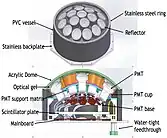 HK will be a water Cherenkov detector, 5 times larger (258 kton of water) than the SK detector. It will be a cylindrical tank of 68 metres (223 ft) diameter and 71 metres (233 ft) height. The tank volume will be divided into the Inner Detector (ID) and the Outer Detector (OD) by a 60 cm-wide inactive cylindrical structure, with its outer edge positioned 1 meter away from vertical and 2 meters away from horizontal tank walls. The structure will optically separate ID from OD and will hold PhotoMultiplier Tubes (PMTs) looking both inwards to the ID and outwards to the OD. In the ID, there will be at least 20000 50 centimetres (20 in) diameter PhotoMultiplier Tubes (PMT) of R12860 type by Hamamatsu Photonics and approximately 800 multi-PMT modules (mPMTs). Each mPMT module consists of nineteen 8 centimetres (3.1 in) diameter photomultiplier tubes encapsulated in a water-proof vessel. The OD will be instrumented with at least 3600 8 centimetres (3.1 in) diameter PMTs coupled with 0.6x30x30 cm3 wavelength shifting (WLS) plates (plates will collect incident photons and transport them to their coupled PMT) and will serve as a veto[note 3] to distinguish interactions occurring inside from particles entering from the outside of the detector (mainly cosmic-ray muons).[18][19][17]