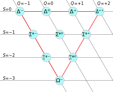 has a baryon number of +1 and hypercharge of −2, giving it strangeness of −3. It takes multiple flavor-changing weak decays for it to decay into a proton or neutron. Murray Gell-Mann's and Yuval Ne'eman's SU(3) model (sometimes called the Eightfold Way) predicted this hyperon's existence, mass and that it will only undergo weak decay processes. Experimental evidence for its existence was discovered in 1964 at Brookhaven National Laboratory. Further examples of its formation and observation using particle accelerators confirmed the SU(3) model.