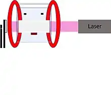 Once the cell is complete, a surface coil (or coils, depending on the desired coil type) is taped to the outside of the cell, which a) allows RF pulses to be produced in order to tip the polarized spins into the detection field (x,y plane) and b) detects the signal produced by the polarized nuclear spins. The cell is placed in an oven which allows for the cell and its contents to be heated so the alkali metal enters the vapor phase, and the cell is centered in a coil system which generates an applied magnetic field (along the z-axis). A laser, tuned to the D1 line (electric-dipole transition[14]) of the alkali metal and with a beam diameter matching the diameter of the optical cell, is then aligned with the optical flats of the cell in such a way where the entirety of the cell is illuminated by laser light to provide the largest polarization possible (Figure 7). The laser can be anywhere between tens of watts to hundreds of watts,[3] where higher the power yields larger polarization but is more costly. In order to further increase polarization, a retro-reflective mirror is placed behind the cell in order to pass the laser light through the cell twice. Additionally, an IR iris is placed behind the mirror, providing information of laser light absorption by the alkali metal atoms. When the laser is illuminating the cell, but the cell is at room temperature, the IR iris is used to measure the percent transmittance of laser light through the cell. As the cell is heated, the rubidium enters the vapor phase and starts to absorb laser light, causing the percent transmittance to decrease. The difference in the IR spectrum between a room temperature spectrum and a spectrum taken while the cell is heated can be used to calculate an estimated rubidium polarization value, PRb.