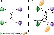 Next, the optically pumped alkali metal collides with the noble gas, allowing for spin exchange to occur where the alkali metal electron polarization is transferred to the noble gas nuclei (Figure 4). There are two mechanisms in which this can occur. The angular momentum can be transferred via binary collisions (Figure 4A, also called two-body collisions) or while the noble gas, N2 buffer gas, and vapor phase alkali metal are held in close proximity via van der Waals forces (Figure 4B, also called three body collisions).[3] In cases where van der Waals forces are very small compared to binary collisions (such is the case for 3He), the noble gas and alkali metal collide and polarization is transferred from the AM to the noble gas.[3] Binary collisions are also possible for 129Xe. At high pressures, van der Waals forces dominate, but at low pressures binary collisions dominate.[3]