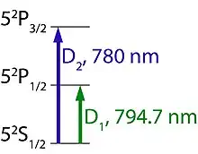 To explain the processes of excitation, optical pumping, and spin exchange easier, the most common alkali metal used for this process, rubidium, will be used as an example. Rubidium has an odd number of electrons, with only one in the outermost shell that can be excited under the right conditions. There are two transitions that can occur, one referred to as the D1 line where the transition occurs from the 52S1/2 state to the 52P1/2 state and another referred to the D2 line where the transition occurs from the 52S1/2 to the 52P3/2 state.[7][11] The D1 and D2 transitions can occur if the rubidium atoms are illuminated with light at a wavelength of 794.7 nm and 780 nm, respectively (Figure 1).[7] While it is possible to cause either excitation, laser technology is well-developed for causing the D1 transition to occur. Those lasers are said to be tuned to the D1 wavelength (794.7 nm) of rubidium.