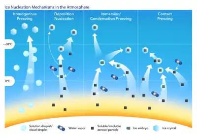 There are a number of mechanisms of ice nucleation in the atmosphere through which ice nuclei can catalyse the formation of ice particles. In the upper troposphere, water vapor can deposit directly onto solid particles. In clouds warmer than about −37 °C where liquid water can persist in a supercooled state, ice nuclei can trigger droplets to freeze.[1]
