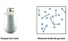 Molecular collisions within a closed container (a propane tank) are shown (right). The arrows represent the random motions and collisions of these molecules. The pressure and temperature of the gas are directly proportional: As temperature increases, the pressure of the propane gas increases by the same factor. A simple consequence of this proportionality is that on a hot summer day, the propane tank pressure will be elevated, and thus propane tanks must be rated to withstand such increases in pressure.