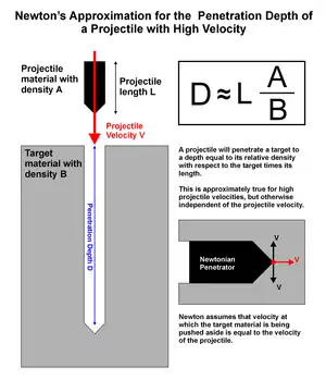 The impact depth of a projectile is the distance it penetrates into a target before coming to a stop. The physicist Sir Isaac Newton first developed this idea to get rough approximations for the impact depth for projectiles traveling at high velocities.