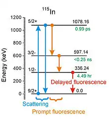 - If the initial state of the target nucleus is its ground (lowest energy) state, then the fluorescent photons will have less energy than that of the incident photon (as seen in the schematic figure). Since the scattering channel is usually the strongest, it can "blind" the instruments being used to detect the fluorescence and early experiments preferred to study IGE by pulsing the source of incident photons while detectors were gated off and then concentrating upon any delayed photons of fluorescence when the instruments could be safely turned back on.