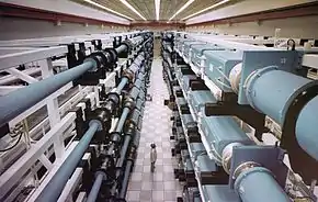 Inertial confinement fusion using lasers rapidly progressed in the late 1970s and early 1980s from being able to deliver only a few joules of laser energy (per pulse) to being able to deliver tens of kilojoules to a target. At this point, very large scientific devices were needed for experimentation. Here, a view of the 10 beam LLNL Nova laser, shown shortly after the laser's completion in 1984. Around the time of the construction of its predecessor, the Shiva laser, laser fusion had entered the realm of "big science".