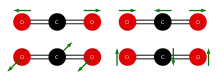 Stretching and bending oscillations of the CO2 carbon dioxide molecule. Upper left: symmetric stretching. Upper right: antisymmetric stretching. Lower line: degenerate pair of bending modes.