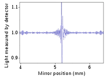 An interferogram from an FTIR measurement. The horizontal axis is the position of the mirror, and the vertical axis is the amount of light detected. This is the "raw data" which can be Fourier transformed to get the actual spectrum.