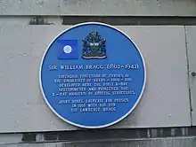 Blue Plaque commemorating the work of William Henry Bragg, featuring the IOP coat of arms