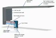 The IMSR instead uses liquid fuel at low pressure. IMSR does not rely on bringing coolant to the reactor or depressurizing the reactor, using instead passive cooling. Heat continuously dissipates from the Core-unit. During normal operation, heat loss is reduced by the moderate temperature of the reactor vessel in normal operation, combined with the stagnant air between the Core-unit and guard vessel, which only allows radiant heat transfer. Radiant heat transfer is a strong function of temperature; any increase in the temperature of the Core-unit will rapidly increase heat loss. Upon shutdown of the primary salt pumps, the reactor passively drops power to a very small level. It can still heat up slowly by the small but constant decay heat as previously described. Due to the large heat capacity of the graphite and the salts, this increase in temperature is slow. The higher temperatures slowly increase thermal radiant heat loss, and subsequent heat loss from the guard vessel itself to the outside air. Low pressure nitrogen flows by natural convection over the outside of the guard vessel, transporting heat to the metal reactor building roof. This roof provides the passive heat loss required, acting as a giant radiator to the outside air.[12] As a result, heat loss is increased while decay heat naturally drops; an equilibrium is reached where temperatures peak and then drop. The thermal dynamics and inertia of the entire system of the Core-unit in its containment silo is sufficient to absorb and disperse decay heat. In the long term, as decay heat dissipates almost completely, and the plant is still not recovered, the reactor would increase power to the level of the heat loss to the internal reactor vessel auxiliary cooling system (IRVACS), and stay at that low power level (and normal temperature) indefinitely.