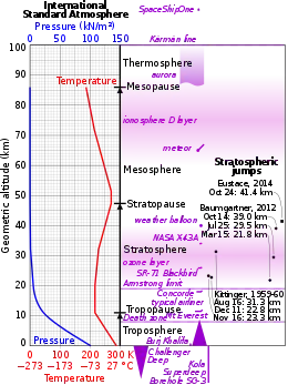 Comparison of a graph of International Standard Atmosphere temperature and pressure and approximate altitudes of various objects and successful stratospheric jumps