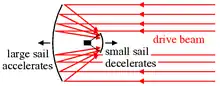Project Orion team member Freeman Dyson proposed in 1968 an interstellar spacecraft using nuclear pulse propulsion that used pure deuterium fusion detonations with a very high fuel-burnup fraction. He computed an exhaust velocity of 15,000 km/s and a 100,000-tonne space vehicle able to achieve a 20,000 km/s delta-v allowing a flight-time to Alpha Centauri of 130 years.[45] Later studies indicate that the top cruise velocity that can theoretically be achieved by a Teller-Ulam thermonuclear unit powered Orion starship, assuming no fuel is saved for slowing back down, is about 8% to 10% of the speed of light (0.08–0.1 c).[46] An atomic (fission) Orion can achieve perhaps 3–5% of the speed of light. A nuclear pulse drive starship powered by fusion-antimatter catalyzed nuclear pulse propulsion units would be similarly in the 10% range and pure matter-antimatter annihilation rockets would be theoretically capable of obtaining a velocity between 50% and 80% of the speed of light. In each case saving fuel for slowing down halves the maximum speed. The concept of using a magnetic sail to decelerate the spacecraft as it approaches its destination has been discussed as an alternative to using propellant, this would allow the ship to travel near the maximum theoretical velocity.[47] Alternative designs utilizing similar principles include Project Longshot, Project Daedalus, and Mini-Mag Orion. The principle of external nuclear pulse propulsion to maximize survivable power has remained common among serious concepts for interstellar flight without external power beaming and for very high-performance interplanetary flight.