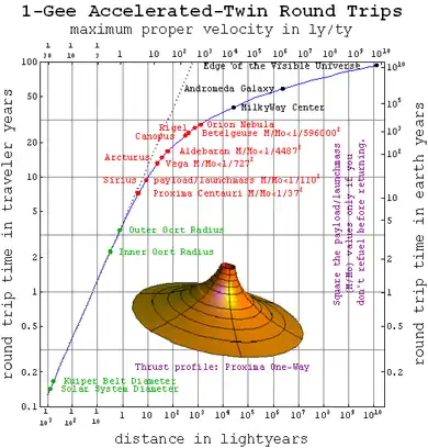 Physicists generally believe faster-than-light travel is impossible. Relativistic time dilation allows a traveler to experience time more slowly, the closer their speed is to the speed of light.[36] This apparent slowing becomes noticeable when velocities above 80% of the speed of light are attained. Clocks aboard an interstellar ship would run slower than Earth clocks, so if a ship's engines were capable of continuously generating around 1 g of acceleration (which is comfortable for humans), the ship could reach almost anywhere in the galaxy and return to Earth within 40 years ship-time (see diagram). Upon return, there would be a difference between the time elapsed on the astronaut's ship and the time elapsed on Earth.