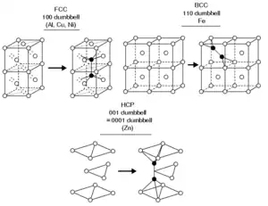 Contrary to what one might intuitively expect, most self-interstitials in metals with a known structure have a 'split' structure, in which two atoms share the same lattice site.[2][3] Typically the center of mass of the two atoms is at the lattice site, and they are displaced symmetrically from it along one of the principal lattice directions. For instance, in several common face-centered cubic (fcc) metals such as copper, nickel and platinum, the ground state structure of the self-interstitial is the split [100] interstitial structure, where two atoms are displaced in a positive and negative [100] direction from the lattice site. In body-centered cubic (bcc) iron the ground state interstitial structure is similarly a [110] split interstitial.