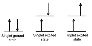 When an electron in a molecule with a singlet ground state is excited (via absorption of radiation) to a higher energy level, either an excited singlet state or an excited triplet state will form. Singlet state is a molecular electronic state such that all electron spins are paired. That is, the spin of the excited electron is still paired with the ground state electron (a pair of electrons in the same energy level must have opposite spins, per the Pauli exclusion principle). In a triplet state the excited electron is no longer paired with the ground state electron; that is, they are parallel (same spin). Since excitation to a triplet state involves an additional "forbidden" spin transition, it is less probable that a triplet state will form when the molecule absorbs radiation.