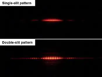 In the double-slit experiment, as originally performed by Thomas Young in 1803,[32] and then Augustin Fresnel a decade later,[32] a beam of light is directed through two narrow, closely spaced slits, producing an interference pattern of light and dark bands on a screen. The same behavior can be demonstrated in water waves: the double-slit experiment was seen as a demonstration of the wave nature of light.
