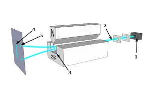 Stern–Gerlach experiment: Silver atoms travelling through an inhomogeneous magnetic field, and being deflected up or down depending on their spin; (1) furnace, (2) beam of silver atoms, (3) inhomogeneous magnetic field, (4) classically expected result, (5) observed result