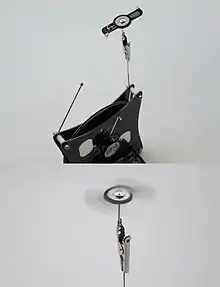 An electrostatic pinwheel, or corona spinner, attached to a small Wimshurst machine (electrostatic generator) is shown stationary and rotating