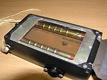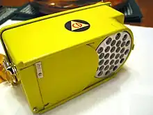 These chambers are normally cylindrical and operate at atmospheric pressure, but to prevent ingress of moisture a filter containing a desiccant is installed in the vent line.[2] This is to stop moisture building up in the interior of the chamber, which would otherwise be introduced by the "pump" effect of changing atmospheric air pressure. These chambers have a cylindrical body made of aluminium or plastic a few millimetres thick. The material is selected to have an atomic number similar to that of air so that the wall is said to be "air equivalent" over a range of radiation beam energies.[1][3][4] This has the effect of ensuring the gas in the chamber is acting as though it were a portion of an infinitely large gas volume, and increases the accuracy by reducing interactions of gamma with the wall material. The higher the atomic number of the wall material, the greater the chance of interaction. The wall thickness is a trade-off between maintaining the air effect with a thicker wall, and increasing sensitivity by using a thinner wall. These chambers often have an end window made of material thin enough, such as mylar, so that beta particles can enter the gas volume. Gamma radiation enters both through the end window and the side walls. For hand-held instruments the wall thickness is made as uniform as possible to reduce photon directionality though any beta window response is obviously highly directional. Vented chambers are susceptible to small changes in efficiency with air pressure [2] and correction factors can be applied for very accurate measurement applications.