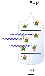 When ultraviolet light is used, the wavelength is swept down the ultraviolet range. At a certain wavelength (λ) and frequency of light (ν=c/λ, where c is the speed of light), the light quanta, whose energy is proportional to the frequency, will have energy high enough to dislodge the least bound electrons. These electrons will be attracted to the positive electrode, and the positive ions remaining after the photoionization will get attracted to the negatively charged electrode. These electrons and ions will establish a current through the tube. The ionization energy will be the energy of photons hνi (h is the Planck constant) that caused a steep rise in the current: Ei = hνi.