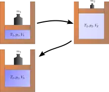 Irreversible adiabatic process: If the cylinder is a perfect insulator, the initial top-left state cannot be reached anymore after it is changed to the one on the top-right. Instead, the state on the bottom left is assumed when going back to the original pressure because energy is converted into heat.
