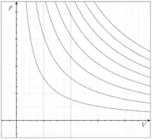 holds. The family of curves generated by this equation is shown in the graph in Figure 1. Each curve is called an isotherm, meaning a curve at a same temperature T. Such graphs are termed indicator diagrams and were first used by James Watt and others to monitor the efficiency of engines. The temperature corresponding to each curve in the figure increases from the lower left to the upper right.