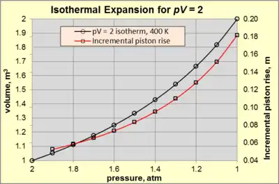 To pursue the nature of isothermal expansion further, note the red line on Figure 3. The fixed value of pV causes an exponential increase in piston rise vs. pressure decrease. For example, a pressure decrease from 2 to 1.9 atm causes a piston rise of 0.0526 m. In comparison, a pressure decrease from 1.1 to 1 atm causes a piston rise of 0.1818 m.