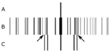 Initial measurements of the displacements were very erratic. The source of the unsystematic errors in measurement of the center of gravity of the displaced lines was found to be due to the complex molecular absorption spectrum of the fill gas. An emission line, passing adjacent to a molecular absorption line of the fill gas, would be differentially absorbed on one side or the other of its nominal center, and the measurement of its wavelength would thus be disturbed. Fig. 5 illustrates the issue. Fig. 5A illustrates an undisplaced emission line. Fig. 5B illustrates the molecular absorption spectrum of the fill gas, obtained by photographing the spectrum of the arc behind the electrode of the canal ray tube (see Fig. 1). Fig. 5C illustrates an undisplaced emission line surrounded by displaced emission lines from H2+ and H3+. At the particular voltage chosen, the lines from H2+ are clear of the molecular absorption lines (see arrows), but the lines from H3+ are not.[1]