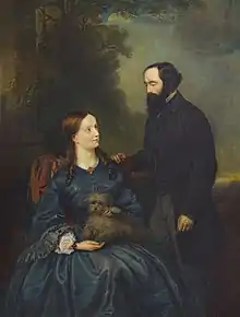 In 1857 Maxwell befriended the Reverend Daniel Dewar, who was then the Principal of Marischal.[69] Through him Maxwell met Dewar's daughter, Katherine Mary Dewar. They were engaged in February 1858 and married in Aberdeen on 2 June 1858. On the marriage record, Maxwell is listed as Professor of Natural Philosophy in Marischal College, Aberdeen.[70] Katherine was seven years Maxwell's senior. Comparatively little is known of her, although it is known that she helped in his lab and worked on experiments in viscosity.[71] Maxwell's biographer and friend, Lewis Campbell, adopted an uncharacteristic reticence on the subject of Katherine, though describing their married life as "one of unexampled devotion".[72]
