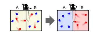 Between 1859 and 1866, he developed the theory of the distributions of velocities in particles of a gas, work later generalised by Ludwig Boltzmann.[126][127] The formula, called the Maxwell–Boltzmann distribution, gives the fraction of gas molecules moving at a specified velocity at any given temperature. In the kinetic theory, temperatures and heat involve only molecular movement. This approach generalised the previously established laws of thermodynamics and explained existing observations and experiments in a better way than had been achieved previously. His work on thermodynamics led him to devise the thought experiment that came to be known as Maxwell's demon, where the second law of thermodynamics is violated by an imaginary being capable of sorting particles by energy.[128]