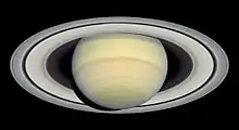 He focused his attention on a problem that had eluded scientists for 200 years: the nature of Saturn's rings. It was unknown how they could remain stable without breaking up, drifting away or crashing into Saturn.[63] The problem took on a particular resonance at that time because St John's College, Cambridge, had chosen it as the topic for the 1857 Adams Prize.[64] Maxwell devoted two years to studying the problem, proving that a regular solid ring could not be stable, while a fluid ring would be forced by wave action to break up into blobs. Since neither was observed, he concluded that the rings must be composed of numerous small particles he called "brick-bats", each independently orbiting Saturn.[64] Maxwell was awarded the £130 Adams Prize in 1859 for his essay "On the stability of the motion of Saturn's rings";[65] he was the only entrant to have made enough headway to submit an entry.[66] His work was so detailed and convincing that when George Biddell Airy read it he commented, "It is one of the most remarkable applications of mathematics to physics that I have ever seen."[1] It was considered the final word on the issue until direct observations by the Voyager flybys of the 1980s confirmed Maxwell's prediction that the rings were composed of particles.[67] It is now understood, however, that the rings' particles are not totally stable, being pulled by gravity onto Saturn. The rings are expected to vanish entirely over the next 300 million years.[68]