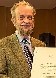 James Scott was born in Beverly, New Jersey. He attended high school in New Jersey and graduated from Harvard University in 1963. After receiving his doctorate in physics from Ohio State University (1966) in the field of high resolution molecular spectroscopy, he worked for six years in the Quantum Electronics Research Laboratory at Bell Laboratories, New Jersey. In 1972 he was appointed professor of physics at the University of Colorado, Boulder, where he established a research program investigating ferroelectrics using laser spectroscopy. It was here that began his groundbreaking work on "integrated ferroelectrics" — semiconductor chips that incorporate thin ferroelectric memory devices. In 1984 he co-founded Symetrix Corporation to develop ferroelectric RAM (FRAM), which licensed its technology to Matsushita. There followed appointments as Dean at the Royal Melbourne Institute of Technology (1992) and the University of New South Wales (1995). In 1997, he worked as a visiting professor in Yokohama thanks to an award from Sony and in Germany after receiving a Humboldt Research Award. In 1999, when he left Symetrix, he became professor of ferroics at the University of Cambridge where his research focused on multiferoed magnetoelectrics and nanometric methods.[2] From 2015 he was a joint professor in both chemistry and physics at the University of St Andrews.
