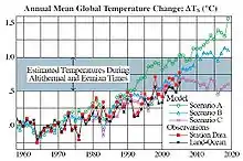 The first climate prediction computed from a general circulation model that was published by Hansen was in 1988, the same year as his well-known Senate testimony.[52] The second generation of the GISS model was used to estimate the change in mean surface temperature based on a variety of scenarios of future greenhouse gas emissions. Hansen concluded that global warming would be evident within the next few decades, and that it would result in temperatures at least as high as during the Eemian. He argued that if the temperature rose 0.4 °C above the 1950–1980 mean for a few years, it would be the "smoking gun" pointing to human-caused global warming.[53]
