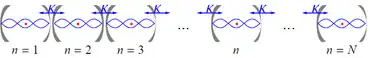 where are Pauli operators for the two-level atom at the n-th cavity. The is the tunneling rate between neighboring cavities, and is the vacuum Rabi frequency which characterizes to the photon-atom interaction strength. The cavity frequency is and atomic transition frequency is . The cavities are treated as periodic, so that the cavity labelled by n = N+1 corresponds to the cavity n = 1.[3] Note that the model exhibits quantum tunneling; this process is similar to the Josephson effect.[6][7]