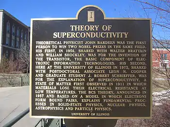 In 1972, Bardeen shared the Nobel Prize in Physics with Leon N Cooper of Brown University and John Robert Schrieffer of the University of Pennsylvania "for their jointly developed theory of superconductivity, usually called the BCS-theory".[39] This was Bardeen's second Nobel Prize in Physics. He became the first person to win two Nobel Prizes in the same field.[40]